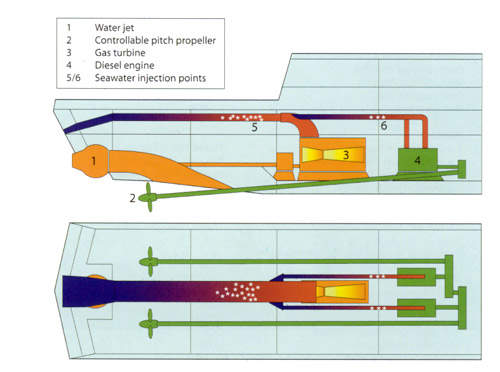 CODAG la MEKO class : https://www.naval-technology.com/projects/meko/attachment/meko4/ cu sistemul WARP de la Waertsila: https://cdn.wartsila.com/docs/default-source/product-files/gears-propulsors/waterjets/brochure-o-p-waterjets.pdf