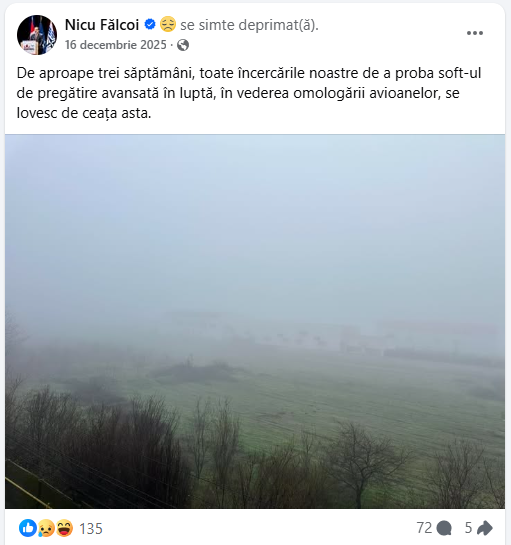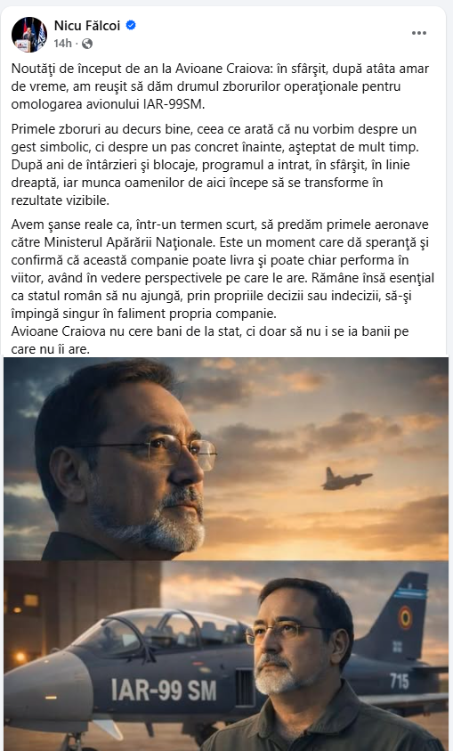 Dupa recentele declaratii ale Ministrului apararii Radu Miruta, cum ca ar cam vrea inchiderea Avioane SA Craiova, „pentru ca acolo s-au intalnit prostul cu smecherul” (sau era invers?)... Nicu Falcoi raspunde pe Facebook, cu putin ajutor AI la imagine si admisii, privind corporativ-increzator spre orizonturi marete…