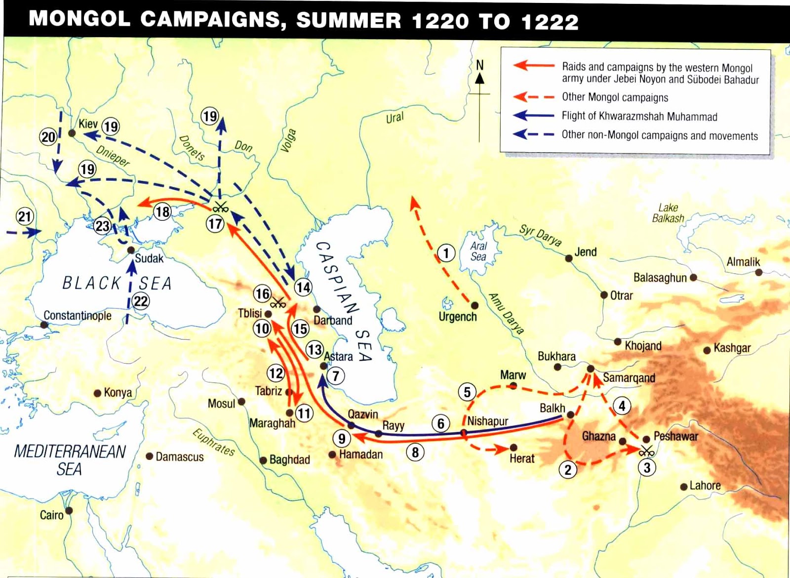 După ocuparea Chinei şi a hanatului Kara-Kitai, Gengis Han, cel mai mare cuceritor al tuturor timpurilor, şi-a îndreptat hoardele spre imperiul Horezmului ce ocupa un teritoriu întins între fluviul Indus, Marea de Aral, Marea Caspică, munţii Caucaz, Marea Neagră, Marea Mediterană şi Marea Roşie sub conducerea de fier a şahului musulman Ala ad-Din Muhammad sau Muhammad al II-lea (a nu se confunda cu sultanul turc cuceritor al Constantinopolelului). Expediţia mongolă a început în toamna anului 1219, în primăvara lui 1220 cei 200000 de soldaţi ai hanului ajungând la poalele munţilor Tian Şan. După trecerea lor, au ajuns pe teritoriul imperiului Horezmului, unde au avut o serie de lupte cu armata de 400000 de oameni ai şahului. După o campanie prelungită, Gengis Han îl zdrobeşte pe şah în bătălia de la Buhara, după care cucereşte o serie de cetăţi şi oraşe. Şahul Muhammad scapă cu fuga, imperiul său este desfiinţat pentru totdeauna.
