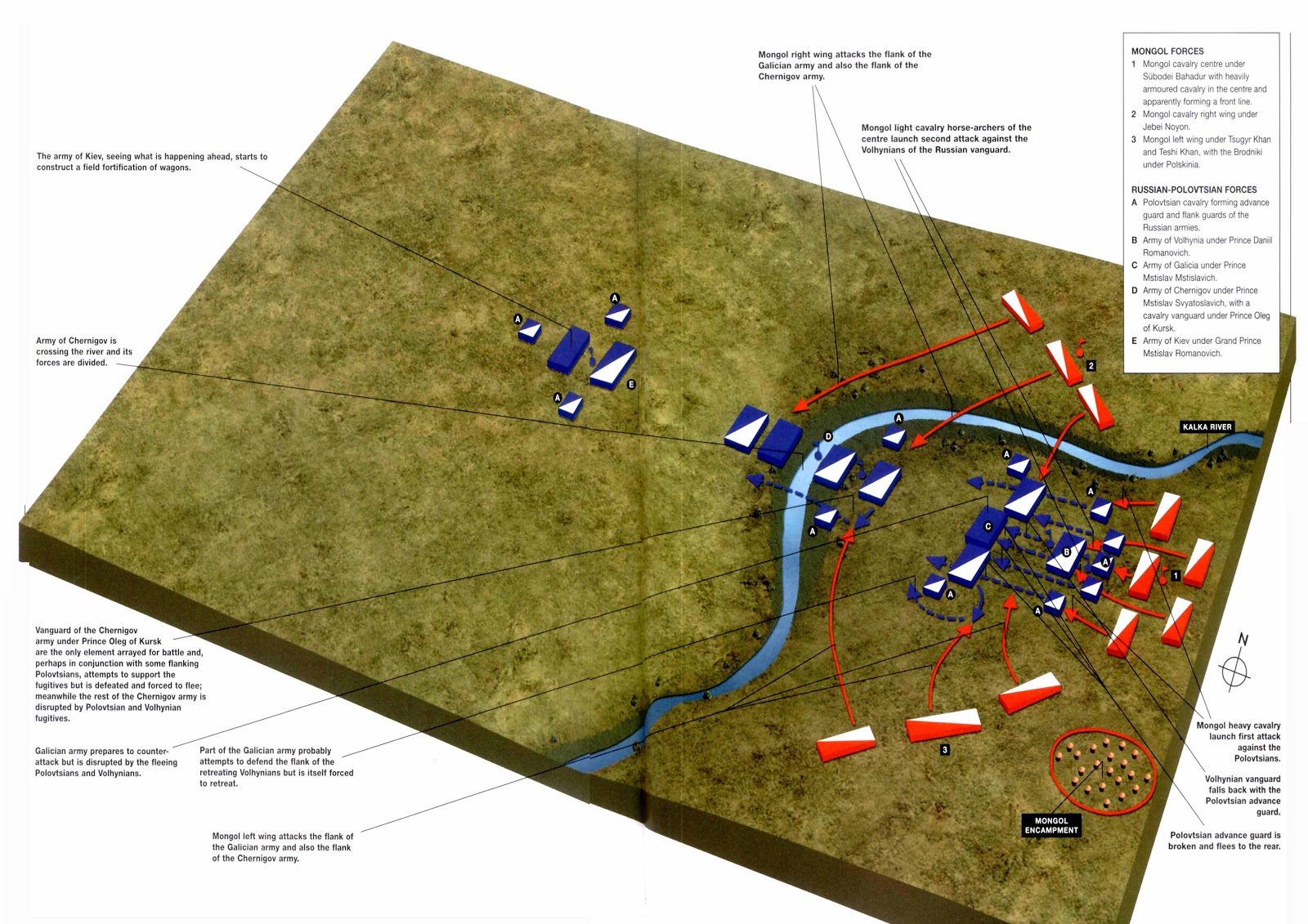 Pe malul celălalt, armata din Kiev cu prinţul Mstislav Romanovici vede dezastrul şi abia apucă să clădească o poziţie defensivă înconjurat de carele folosite la transport, înainte ca furia mongolă să se năpustească asupra lui. Rezistă şi începe o retragere înceată, cu tot cu carele care îl înconjoară, asaltat continuu de atacurile şi săgeţile mongolilor. După trei zile, epuizaţi şi lipsiţi de apă, acceptă inevitabilul, capitularea. Mongolii îl trimit pe Ploscânea ca şi parlamentar, care le promite viaţa în schimbul capitulării. Pentru a fi siguri, principii ruşi îl pun pe acesta să sărute crucea, după care capitulează. Dar mongolii nu se ţin de cuvânt, o parte din luptătorii ruşi sunt masacraţi imediat ce ies din tabără. După părerea mea este improbabil ca Plocânea să fi ştiut dinainte de planurile mongolilor referitoare la prizonieri, altfel, ca şi creştin, nu ar fi jurat pe cruce. Sau poate da?